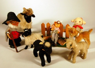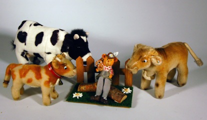 Unsere Kühe und Schafe sind aus den 50 er Jahren und von Steiff. Ausnahme ist die Wackelkuh, die aber eine tolle Wächterin der Milchkanne ist.