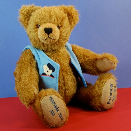 Der klassisch-antike Stil des Teddys wird auch durch die blaue Filzweste, die der „Brummbär“ trägt, hervorgehoben. Die Fußsohlen des Bären sind mit „TEDDYBÄR TOTAL“, der Jahreszahl 2011, dem Namen des Bären und der individuellen Limitierungsnummer bestickt. Die Filzweste ist sowohl auf dem Rücken als auch auf der Vorderseite mit dem TEDDYBÄR TOTAL Logo bestickt.