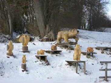 Wieder einmal kamen wir nach Steingarden und am Hang stehen sie- die wunderbaren Gesellen vom Bärenschnitzer Thomas Jung. Hans hat uns - ebenso wie zwei Jahre zuvor Olaf - „angeblinzelt“ und nun ist er angekommen- in Brunos Bärenmuseum ist er nun Mittelpunkt der Erinnerungsgruppe an Bruno JJ1.