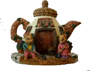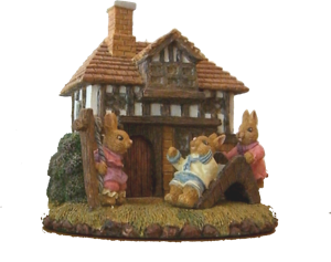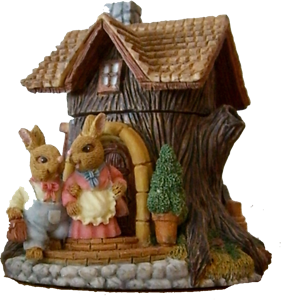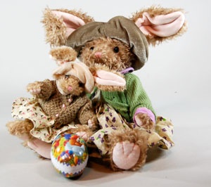 Hasenmamma und Kind (beide no names) mit Keramik-Hasenhäusern aus unserer Sammlung