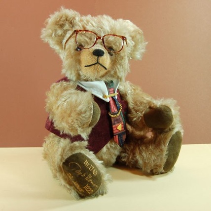 „Die Brille drückt heute wieder....“ so nimmt er sie halt in die Hand. Wir sehen hier Opabär, der zu Ehren von Rolf G. Hermann 1922-1995. Ihm haben wir zahlreiche schöne Hermann Coburg Teddybären zu verdanken.