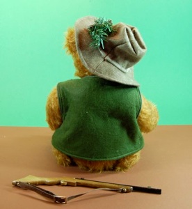 Ein ganz großer Jäger will er mal werden- unser Alpin Hunter Flori Hubertus mit der Nr. 12, der von Herman Coburg im März 2009 für einen exklusiven Katalogversandhändler in den USA in einer Auflage von 100 Exemplaren entwickelt wurde. Er ist ca. 38 cm groß, trägt eine schicke Lodenweste und das Hubertuszeichen, dem Schutzpatron der Jäger am Filzhut. Flori schiesst aber nicht auf unsere Wildsau von Kösen, er liebt sie und erfreut sich gemeinsam mit ihr an den Besonderheiten der Bayerischen Berge.
