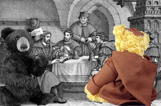 © Dr. Ursula Fellberg: Der Bär „Martin Luther“ vor einen Bild im Gasthof Schwarzer Bär in Jena zusammen mit unserem kleinen Grizzlybären von Steiff.