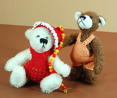 Die beiden Helden heißen Bambino und Baci. Sie- Bambino trägt ein Häckelkleidchen und eine passende Mütze, an der ihr ganz besonderes Schmuckstück aus Perlen hängt. Er - Baci, der fesche Freund hat eine Latzhose an und beschützt seine Freundin. Beide sind von Elisabeth Sykora aus Salzburg.
