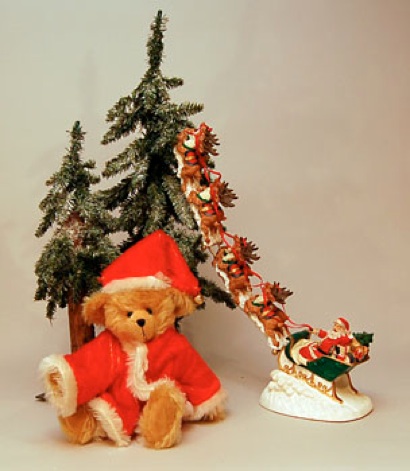 Diese Weihnachtsmann-Bären sind von Steiff und präsentieren sich mit wunderschönen Stücken aus unserer Weihnachtsdekoration.