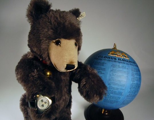 Unser Watch Teddy Bär ist von Steiff aus der Serie 606304 und im Jahren 1992 geboren. Mit seinen ca. 43 cm, aus Mohair Webpelz geschaffen, trägt er die Steiff Watch mit schwarzem Armband stolz durch die Gegend. Sei Glöckchen kündigt ihn immer an. Er bleibt aber lieber im gemütlichen Bayern statt das Weltgeschehen zu erkunden.