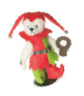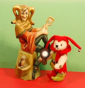 Unser Mini ist von Teddy Hermann (Design: Traudel Mischner-Hermann) und trägt ein grün-rotes Narrenkostüm mit Schnabelschuhen und Narrenkappe. In seiner Hand hält er einen Filzspiegel; seine Freunde sind von Steiff (Eule rechts) und xxx (Eulenpaar links(. Die Holzfigur gehört zur Sammlung Fellberg. Bruno ist bekannt.....