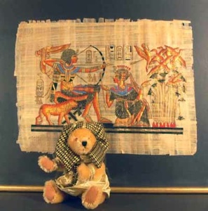 Der kleine Bär, der sich hier mit auf das Foto gesellt hat, ist ein Souvenirbär von der Tutanchamun Ausstellung und sonnt sich im Glanze der Maske seines Herrschers aus Gold.