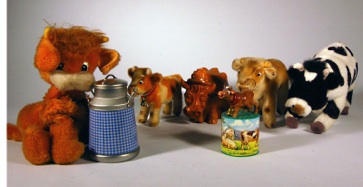 Unsere Kühe und Schafe sind aus den 50 er Jahren und von Steiff. Ausnahme ist die Wackelkuh, die aber eine tolle Wächterin der Milchkanne ist.