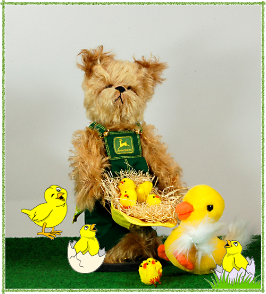 Der Teddy ist von John Deere und trägt eine grüne Latzhose und eine gelbe Mütze. Die Küken gehören zum „Outfit“ und die Kükenmama lag mal bei uns im Osternest.