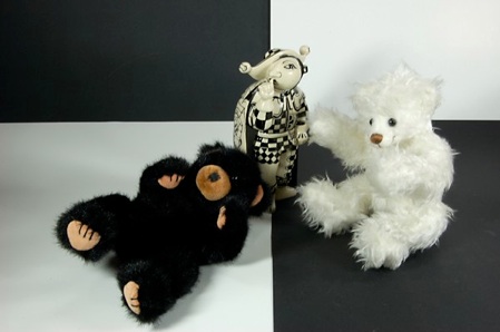Zwei Plüschgesellen lassen sich vom Eulenspiegel belehren, es sind unsere Teddybären Plüsch und Plum.