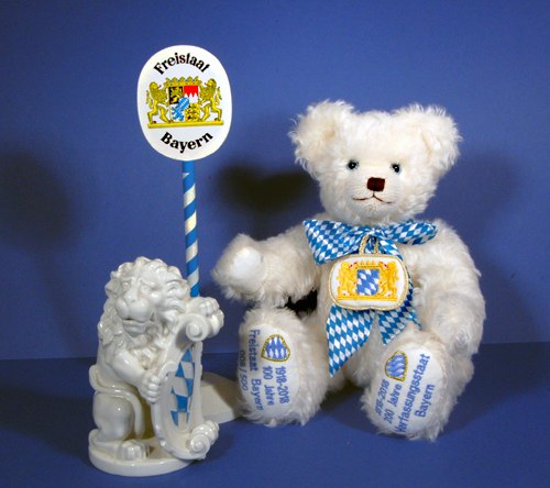 Er ist ein echter Hermann Coburg-Teddy und trägt die weiß-blaue Rauten vollen Stolz. Der Jubiläumsbär zeigt die besonderen Ereignisse auf seinen Pfoten: