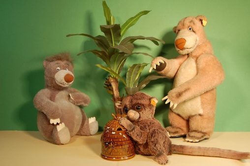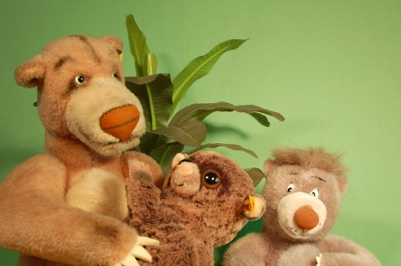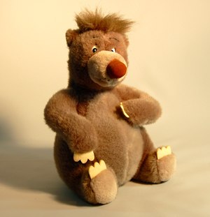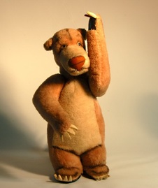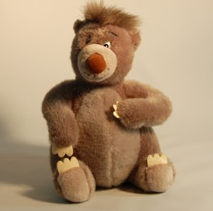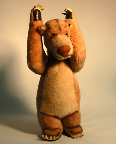 Unser Balu ist von Steiff aus den Jahren 1958-1974; zu uns in 2014 ins Bärenmuseum gekommen. Er ist 40 cm groß und hat einen drehbaren Kopf und ebensolche Arme, Pfoten sind alle mit Lederbesatz und er trägt stolz Fahne und den Knopf im Ohr.