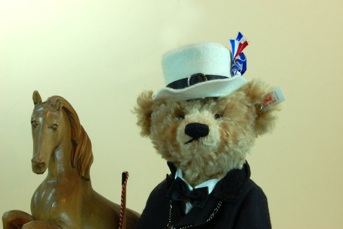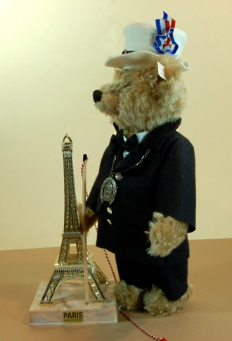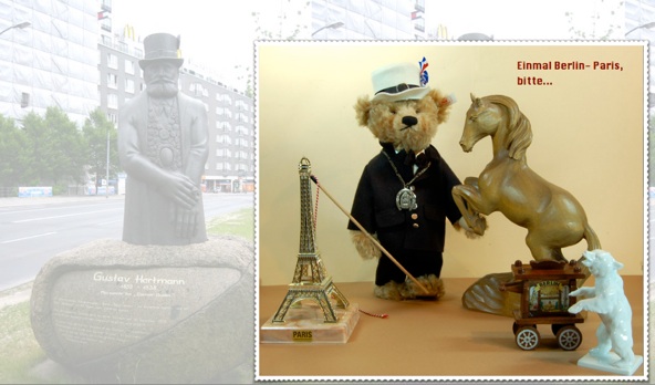 Der Teddy trägt einen typischen Anzug der damaligen Zeit mit weißem Zylinder. und den Abzeichen für seine spektakuläre Fahrt. Der Eifelturm ist ein Souvenir aus Paris, Pferd, Bär und Leierkasten gehören zur Sammlung Fellberg. Das Foto ist in Berlin aufgenommen worden.