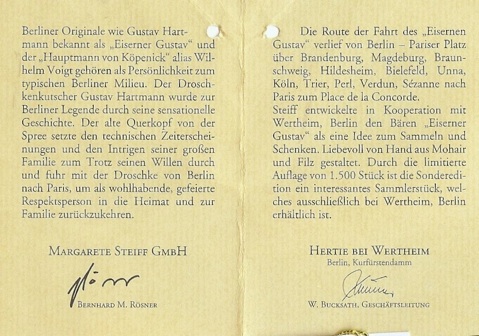 Unser Eiserner Gustav ist von Steiff und wurde speziell in Kooperation mit dem Berliner Kaufhaus Wertheim anno 1996 hergestellt. Sein Denkmal steht in der Potsdamer Straße.