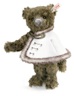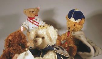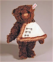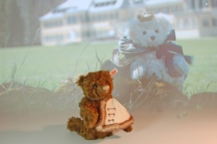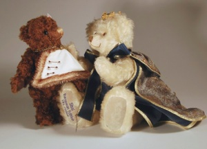 Dieser ist mit gespitztem Webplüsch abgesetzt und mit feinen Stickereien verziert. Die Kordel aus Seide und eingoldfarbenem Knopf, der mit dem Emblem des Königshauses verziert ist sowie das dunkelbraune Fell aus gewelltem dunkelbraunem Mohair machen ihn zu einem sehr attraktiven TeddyBären von Adel.