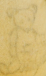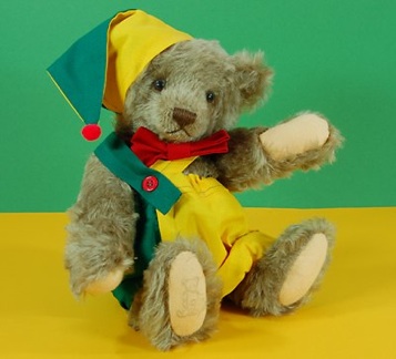 Unser Teddybär ist ein Künstlerteddy mit gelenkigen Armen und Beinen und wunderschön gekleidet. Er stammt aus den Summerer Kunststuben, die es seinerzeit in Starnberg gab. Auf seinen Pfoten findet sich der schon etwas verblichene Abdruck seiner Herkunft.