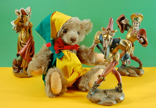 Teddybär Harlekin repräsentiert eine bekannte Figur der italienischen Commedia dell‘arte. Sein Name lässt sich aus dem Italienischen mit „kleiner Teufel“ erklären und das sieht man hier: er freut sich „diebisch“ über den Tanz der Moriskentänzer; Abbilder der 1480 von Erasmus Grasser geschaffenen, die heute im Alten Rathaus von München ihren Dienst tun.