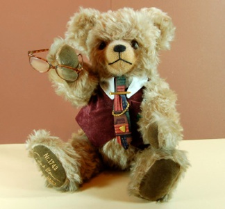 „Die Brille drückt heute wieder....“ so nimmt er sie halt in die Hand. Wir sehen hier Opabär, der zu Ehren von Rolf G. Hermann 1922-1995. Ihm haben wir zahlreiche schöne Hermann Coburg Teddybären zu verdanken.