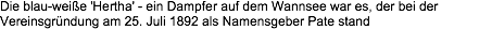 Am 25. Juli 2017 feiert die „Alte Dame“, der traditionsreiche Berliner Fußballverein Hertha BSC seinen 125. Geburtstag.Hertha, Berliner Sport-Club e.V., gern von den Berlinern auch „Alte Dame“ genannt. Die blau-weiße 'Hertha' - ein Dampfer auf dem Wannsee war es, der bei der Vereinsgründung am 25. Juli 1892 als Namensgeber Pate stand.