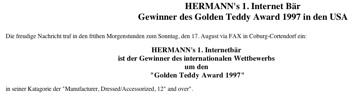 eine wahre Rarität, unser Preisträger aus dem Hause Hermann-Coburg. der kurzsichtige Internet-Bär, dessen eine Tatze schon mit der PC-Maus verwachsen ist, wurde 1997 mit einem Golden Teddy Award prämiert.