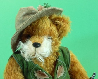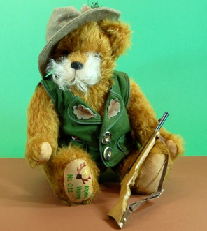 Ein ganz großer Jäger will er mal werden- unser Alpin Hunter Flori Hubertus mit der Nr. 12, der von Herman Coburg im März 2009 für einen exklusiven Katalogversandhändler in den USA in einer Auflage von 100 Exemplaren entwickelt wurde. Er ist ca. 38 cm groß, trägt eine schicke Lodenweste und das Hubertuszeichen, dem Schutzpatron der Jäger am Filzhut. Flori schiesst aber nicht auf unsere Wildsau von Kösen, er liebt sie und erfreut sich gemeinsam mit ihr an den Besonderheiten der Bayerischen Berge.