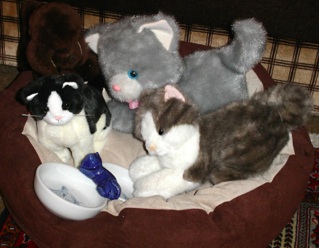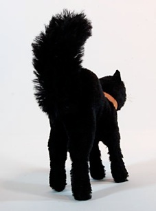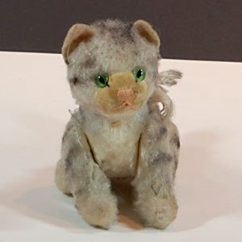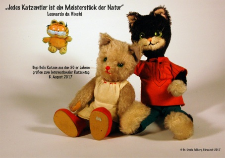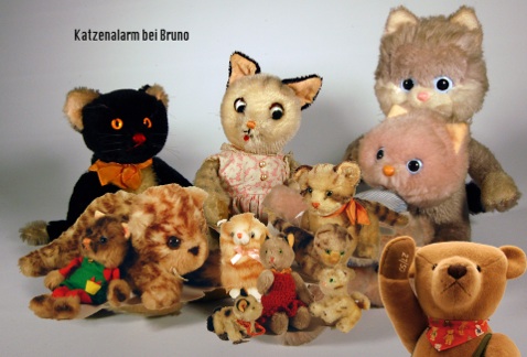 Unsere beiden Katzen sind aus den Jahren 1951 (die weiße) und 1954 (die schwarze) und stehen seitdem immer miteinander in der Sammlung Fellberg. Beide sind von Steiff und tragen noch den Knopf im Ohr. Allerdings habe ich als Kind die Steiff-Fahnen abgeschnitten: heute ein unverzeihlicher Fehler; damals kindliches Schönheitsgefühl.