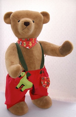 Ich bin stolze 1,30 m groß und trage eine Latzhose mit meinem Pferdchen und wie ein echter Gentlemen Tuch und „Krawatte“ mit Bärchenmuster