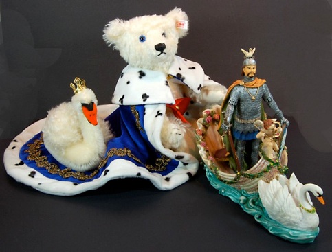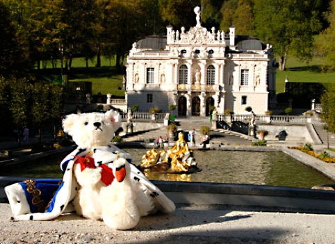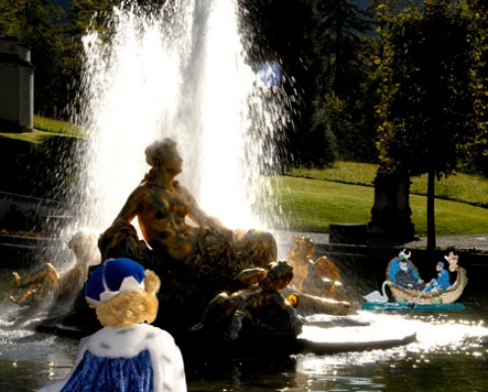 Ludwig II. mit seinem Schwan vor seinem Schloss Linderhof