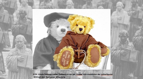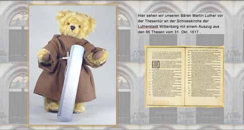 Unser (Teddy)-Bär Martin Luther ist nach dem berühmten Reformator benannt, der am 10. November 1483 in Eisleben geboren und am 18. Februar 1546 dort gestorben ist. Er war ein Augustinermönch und Theologieprofessor. Sein Ziel war es , die Fehlentwicklungen in der Katholischen Kirche durch ausschließliche Orientierung an Jesus Christus als dem fleischgewordenen Wort Gottes zu beseitigen. Seine Entdeckung der Gnade Gottes, seine Predigten und Schriften – besonders seine Lutherbibel – entfalteten breite Wirkung.
