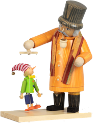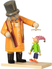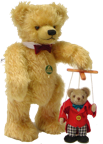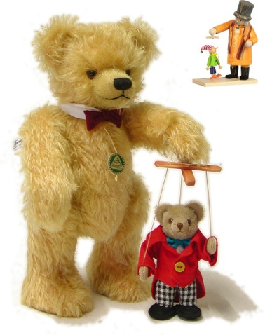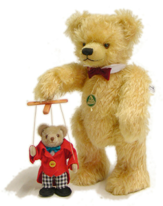 Der tolle Marionettenbär ist der 19. Sonneberger Museumsbär von Hermann Coburg und mit seinem wertvollen Mohairplüsch, in gold-gelb ein prachtvoller Bursche. Der kleine Teddy ist eine Handspielfigur und zappelt gar echt und lebhaft an der Hand seines Meisters. „Spieglein, Spieglein... nicht an der Wand... sondern vor dem Zappelphilipp, wer ist der lebhafteste im Land“?