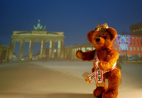 Der linke Teddy ist von Hermann Coburg („Berliner Anniversary Bär 2014“ Nr.15) und zeigt mit seinen 32 cm stolz die Deutschlandfahne und ein Stück bemalter Mauer aus Filz. Er ist zum 25. Jahrestag des Mauerfalls in 2014 erschienen.