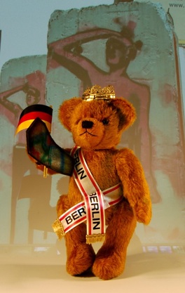 Er kam zum 25. Jahrestag des Mauerfalls aus Berlin zu uns ins Bärenmuseum. Der feierliche Teddybär ist von Hermann Coburg und ca. 32 cm groß. In seiner linken Pfote hält er eine Deutschlandfahne, garniert von einem bemalten Mauerstück aus Filz.