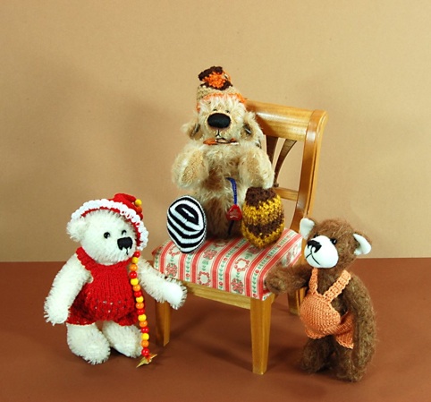 Die beiden Helden heißen Bambino und Baci. Sie- Bambino trägt ein Häckelkleidchen und eine passende Mütze, an der ihr ganz besonderes Schmuckstück aus Perlen hängt. Er - Baci, der fesche Freund hat eine Latzhose an und beschützt seine Freundin. Beide sind von Elisabeth Sykora aus Salzburg.