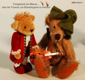 Unser Mozartbär hat auf jeden Fall einer der Vorlieben von Mozart übernommen und trägt pompöse und sehr ausgefallenen Kleidung. Zu seinem Jubiläum „250 Jahre Mozart“ gab es einige überarbeitete Aufführungen, vor allem in Salzburg. Da kann man bei einer der Kritiken u.a. lesen: