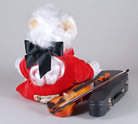 Der Bär „Amadeus Mozart“ hat seine Noten zur „Kleinen Nachtmusik“ in den Händen und hat auch eine eingebaute Spieluhr, die dieses wunderbare Stück spielt. Mozart ist mit seinem weißen Zopf auch von hinten attraktiv.