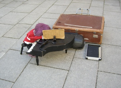 Er sitzt dann vor seinem Geburtshaus und wartet auf Spenden.