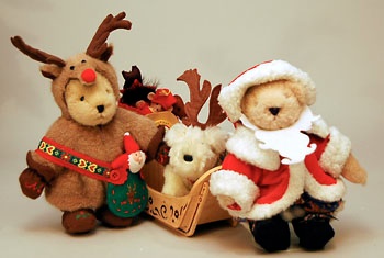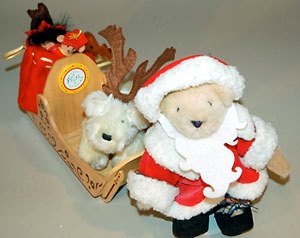Hier sind es Santa Claus mit seinem Schlittenhund, der den Sack mit Spielzeug bewacht und ein Teddy, der sich als Renntier verkleidet hat.