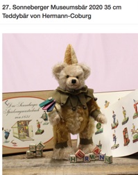 Ratschi ist der 27. Sonneberger Museumsbär von Hermann Coburg und mit seinem wertvollen Mohairplüsch, aus drei Farben hell-beige, gold-gelb und messing-braun, toll geworden. Jedes Jahr im November stellt Hermann Coburg einen besonderen Teddy vor, der ihrer alten Heimatstadt Sonneberg und dem dort ansässigen Spielzeug-museum, gegründet 1901, gewidmet ist. Die Nummer eins dieses Modells ist jeweils für das Museum reserviert.