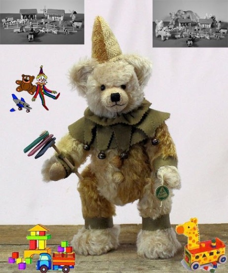Mit seiner symbolischen kleinen Spielzeug-Ratsche in der Hand macht unser Teddy Krach und belebt unser Bärenmuseum.
