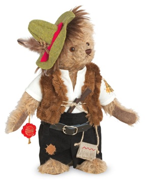 Unser Teddybär Räuber ist von Teddy Hermann (Design: Traudel Mischner-Hermann) und mit 28 cm ein prächtiger Kerl. Bekleidet ist der Räuber mit einer schwarzen geflickten Hose mit Gürtel, einem weißen geflickten Hemd, einer braunen Fellweste und einem grünen Hut mit Federschmuck. In seiner Hose steckt ein Schießgewehr.