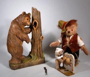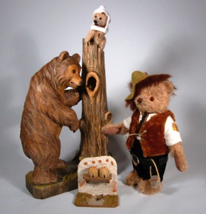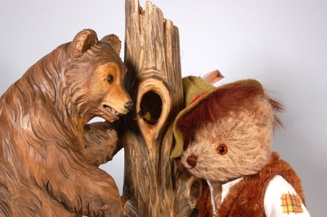 Er sucht im Wald gern nach Bienchen und hat dabei Unterstützung von einem echten Braunbären bekommen: aus Holz geschnitzt und in Oberammergau geboren.