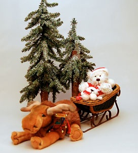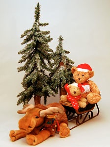 Unsere Weihnachtsbären fahren mit dem Schlitten spazieren und lassen sich von einem schmucken Renntier durch den Wald ziehen.