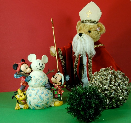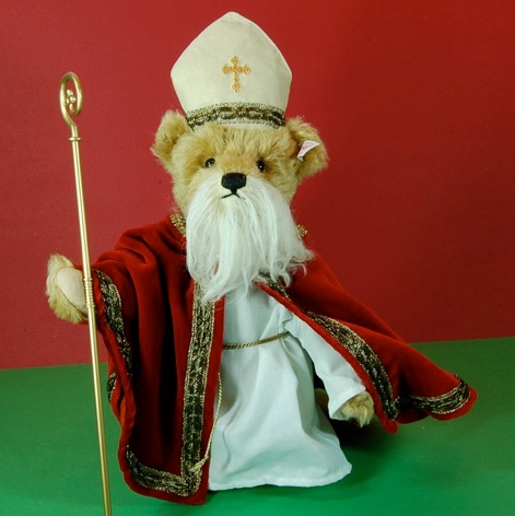 Sankt Nikolaus ist ein imposanter Teddybär von Steiff. Er hat einen getragenen, fast ernsten Gesichtsausdruck, wie es ein wenig in unsere heutige Zeit zu passen scheint. Voller Würde trägt er seinen Nikolausstab in der Pfote. Auf dem Kopf die klassische Mitra, die mit einem goldenen Kreuz und einer schmucken Borte geziert ist, ebenso wie sein Rauchmantel. Sein charaktervoller langer Bart ist aus weißem Mohair.