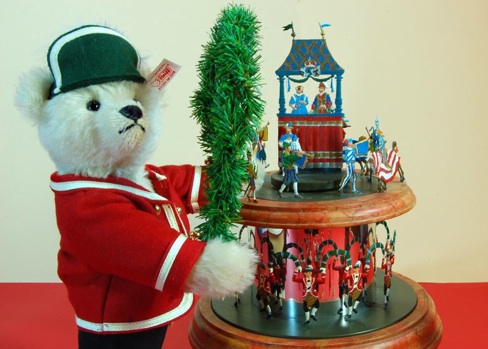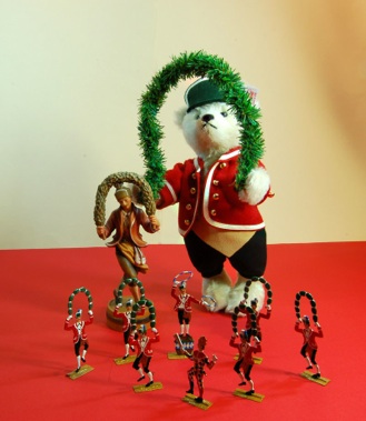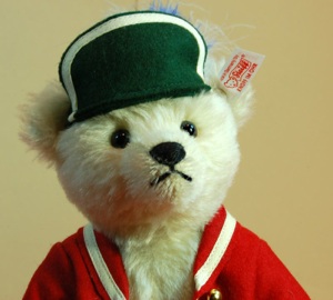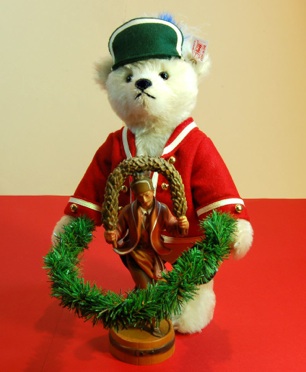 Unser Schäffler Teddybär ist von Steiff aus dem Jahr 2012 und ca. 28 cm groß mit der Nummer 307. Wir haben ihn 2013 im Steiff Museum in Giengen entdeckt. Er zeigt sich hier mit lustigen Tänzern aus Zinn und Holz. Es gibt die sogen. Vortänzer, die Fassschlager (die mit Hämmern auf Fässer schlagen), die Spaßmacher ("Kasperl") und Reifenschwinger. Alle tragen das Schäfflerkostüm mit schwarzen Schuhen, weißen Kniestrümpfen, schwarzer Kniebundhose, Schurzleder, roter Jacke und grüner Kappe mit weißem Federbusch gekleidet.