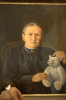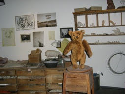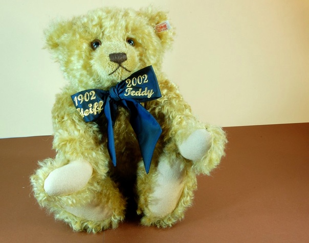 Im Jahr 2002 feierten wir den 100. Geburtstag des Teddybären. Richard Steiff, ein Neffe der Firmen-gründerin Margarete Steiff entwickelte 1902 einen zotteligen Mohairbären mit dem Namen Bär P55PB (Nachbildung findet sich auf unserem Foto aus dem SteiffMuseum in Gingen). Der Bär wurde auf der Leipziger Messe von einem Amerikaner gesehen und 3.000 Stück gekauft.