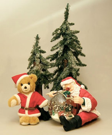 Diese Weihnachtsmann-Bären sind von Steiff und präsentieren sich mit wunderschönen Stücken aus unserer Weihnachtsdekoration.
