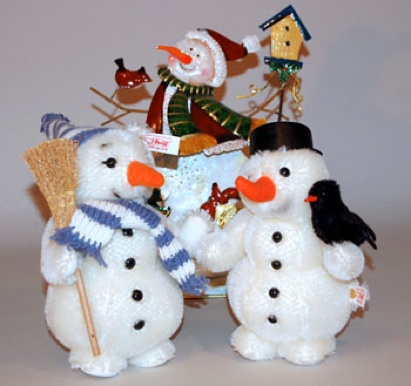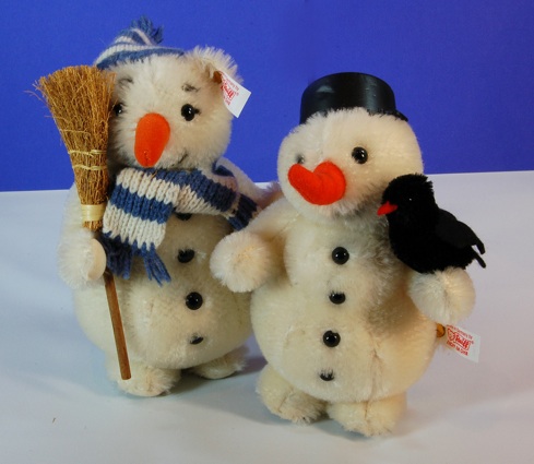 Unsere beiden Schneemänner sind von Steiff; der „Schneemann mit Rabe“ hat die Nummer 386 und „ Schneemann Pudelmütze“ hat die Nummer 1426; beide in einer Auflage von 3.000 Stück hergestellt.