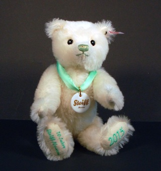 Bestickung „2015“ und die rechte Sohle „10 Jahre Steiff Museum”. Die Porzellanplakette auf seiner Brust