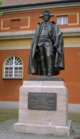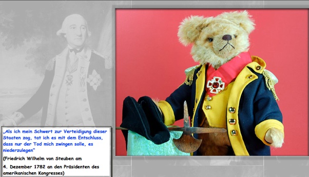 Doch welchen Teddybären interessiert das heute noch? – Zählen tun doch nur Taten und derer gibt es zahlreiche: Er nahm als Infanterie- und später Generalstabsoffizier in der preußischen Armee am Sieben-jährigen Krieg teil, wurde Träger des „Hausordens der Treue“ und war zu vital, um ein ruhiges und behagliches Leben zu führen. Heute findet jährlich im September ihm zu Ehren in New York die Steubenparade statt; von seinen vielen Denkmälern sind insbesondere das im Park des Potsdamer Stadtschlosses hinter dem Marstall sowie die (gleich aussehenden) Denkmäler in Magdeburg (oberes Bild) und Washington gegenüber dem Weißen Haus (unteres Bild) zu erwähnen.